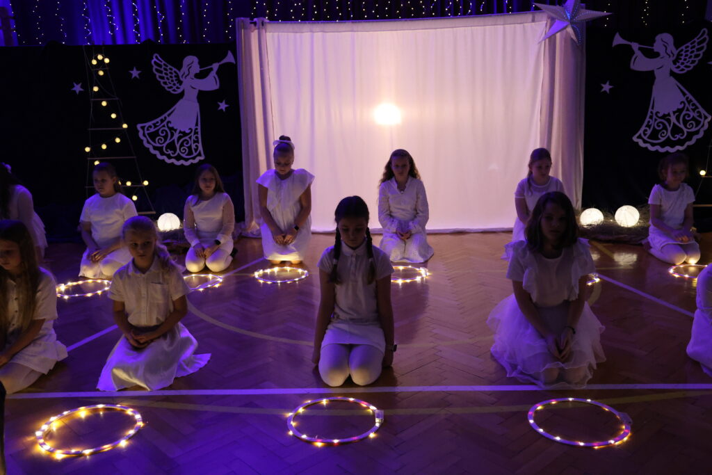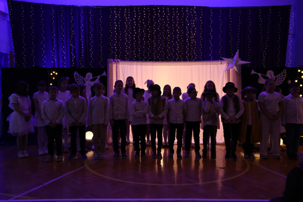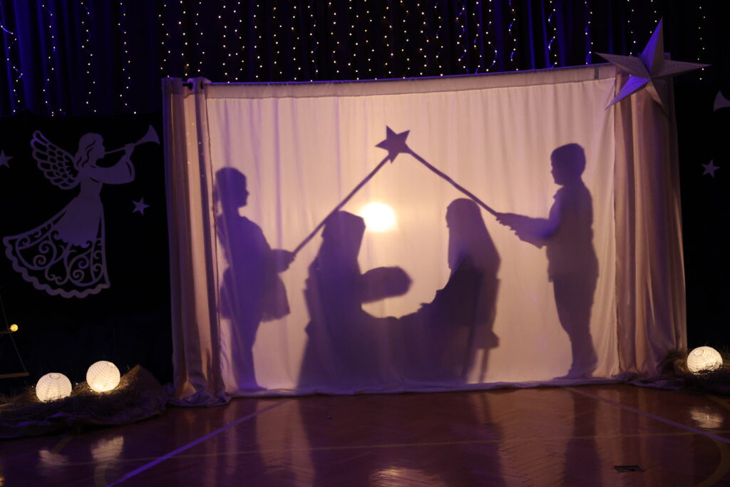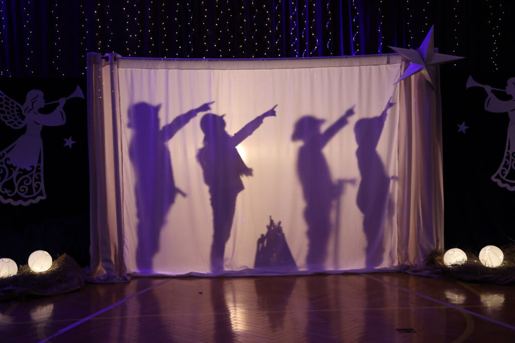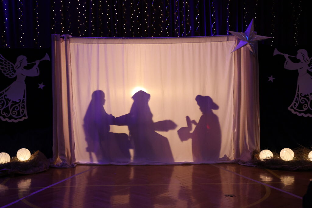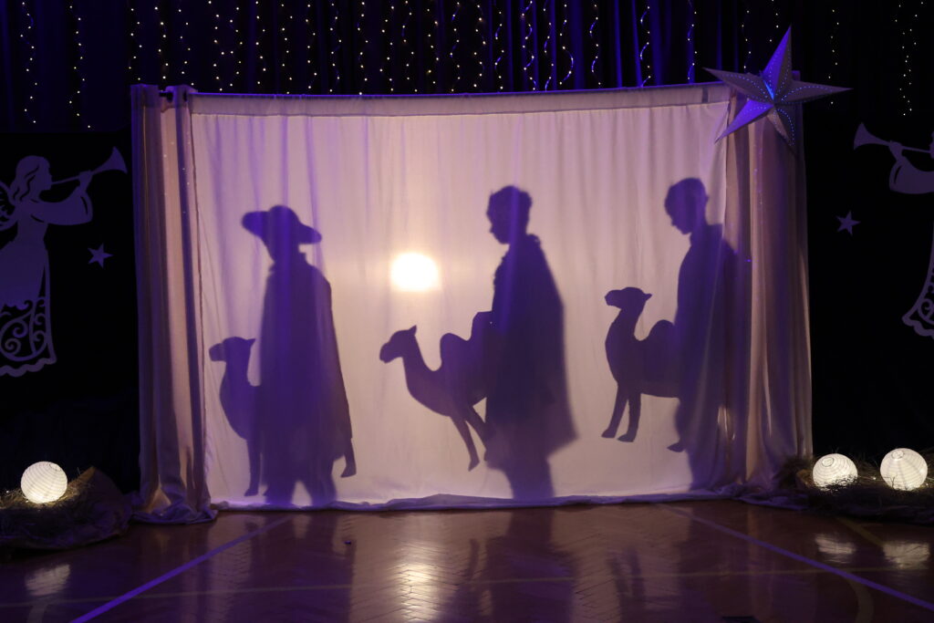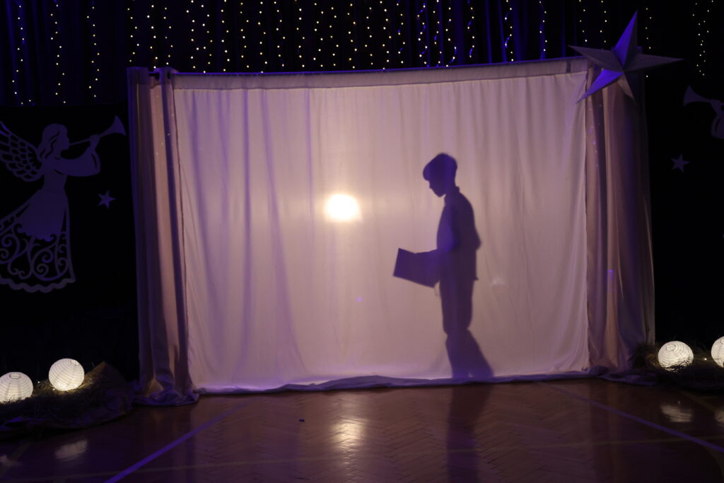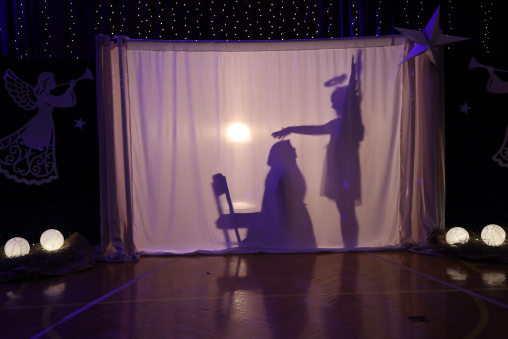 Tegoroczne przedstawienie przybrało niezwykłą formę teatru cieni, który w subtelny  i poruszający sposób opowiedział historię Świąt Bożego Narodzenia. Delikatne światło, symboliczne obrazy i starannie dobrane  kolędy i pastorałki stworzyły przestrzeń do wyciszenia oraz refleksji. Muzyka prowadziła widzów ku rozmyślaniom nad tym, co w świątecznym czasie jest naprawdę ważne – nad miłością, bliskością drugiego człowieka, dobrem, spokojem serca i obecnością. Cisza przeplatana poruszającymi dźwiękami pozwoliła każdemu zatrzymać się na chwilę i wsłuchać nie tylko w muzykę, ale i we własne myśli. Uczniowie, poprzez prostotę formy     i głębię przekazu, pokazali, że prawdziwa magia Świąt nie kryje się w słowach ani w pośpiechu, lecz w tym, co niewidoczne, a tak bardzo odczuwalne.