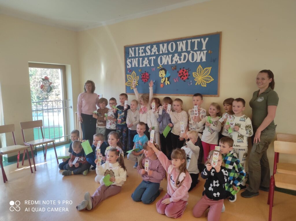 Dzieci wykonały także pracę plastyczną, w której wykorzystano kolorowe naklejki owadów jako dekoracja do zakładki książki. W spotkaniu wzięła udział grupa „Motylków” z przedszkola oraz uczniowie klas 3 wraz z wychowawcami. Obecni byli nauczyciele świetlicy oraz pani wicedyrektor Marta Karbowniczek.
