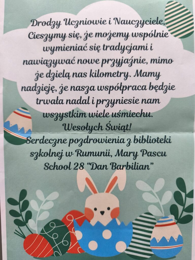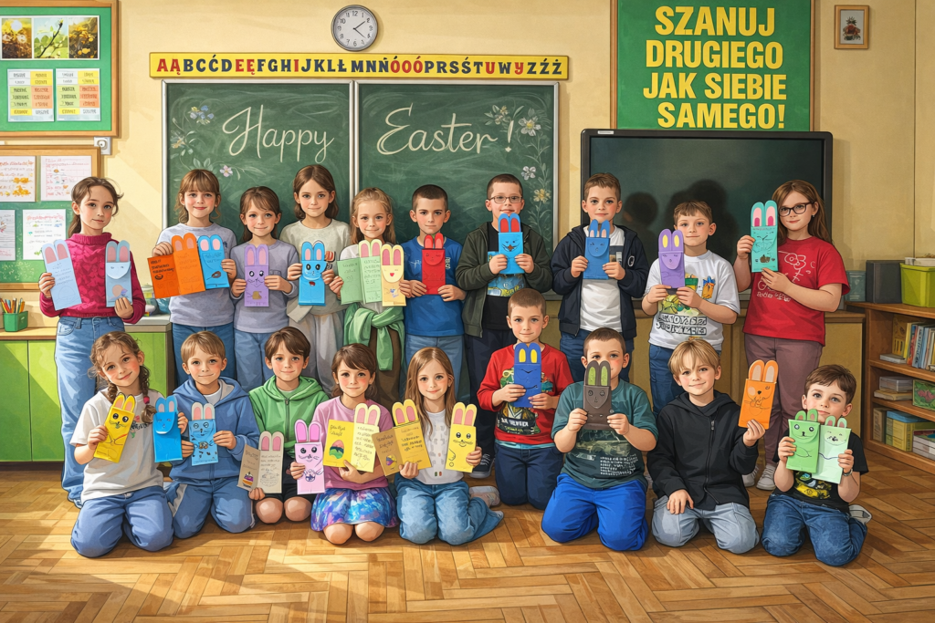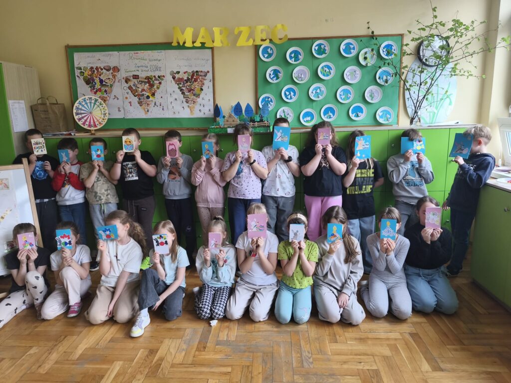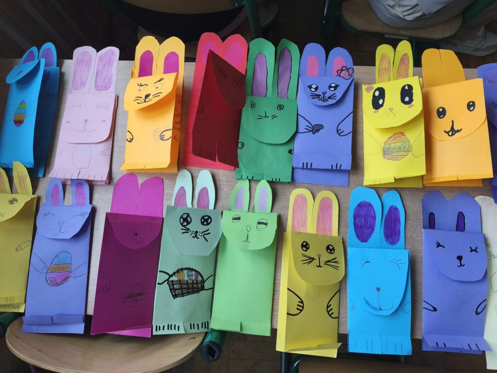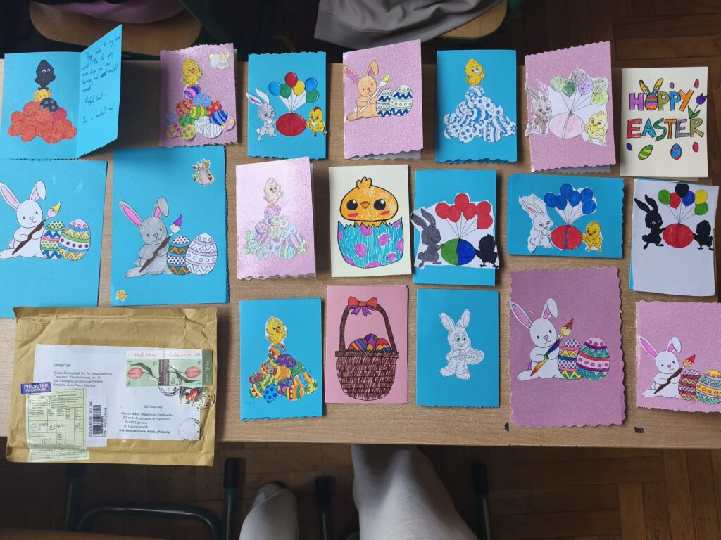 W ramach programu Earsmus Plus, cztery nauczycielki: Dorota Wikło, Anna Więckowska, Marzena Pawlik i Małgorzata Dzitkowska, w ubiegłe wakacje, wzięły udział w kursie językowym „Basic English”, organizowanym przez organizację Mobility Friends. Zdobyte podczas szkolenia umiejętności wykorzystały w praktyce, realizując międzynarodowy projekt na platformie eTwinning, pod nazwą: Easter Cards Around Europe – Kartki Wielkanocne w Europie. Projekt polegał na znalezieniu partnerskiej szkoły w Europie, własnoręcznym wykonaniu kartek wielkanocnych przez naszych uczniów i wysłaniu do partnerskiej szkoły, stworzeniu projektu logo, oraz umieszczeniu informacji o naszym kraju i miejscowości, naszej szkole, uczniach, nauczycielach oraz efektach prac plastycznych na Padlecie, utworzonym przez założycielkę projektu, nauczycielkę z Rumunii. Naszą partnerską szkołą była szkoła z Rumunii, skąd nasi uczniowie otrzymali kartki wielkanocne zrobione przez rumuńskich uczniów, a efekty naszej pracy zostały wysłane do naszych przyjaciół w Rumunii. W projekcie brali udział uczniowie klasy 2a z wychowaczynią p. Małgorzatą Dzitkowską. Uczniowie z wielką ekscytacją wzięli udział w ich pierwszym, międzynarodowym projekcie. W realizację tego projektu były zaangażowane wszystkie nauczycielki biorące udział w kursie językowym, dzieląc między sobą poszczególne zadania. Realizacja tego przedsięwzięcia stanowiła jednocześnie formę ewaluacji zadań i celów przyjętych w programie Erasmus Plus. Rezultaty zrealizowanego projektu można zobaczyć pod udostępnionymi linkami.