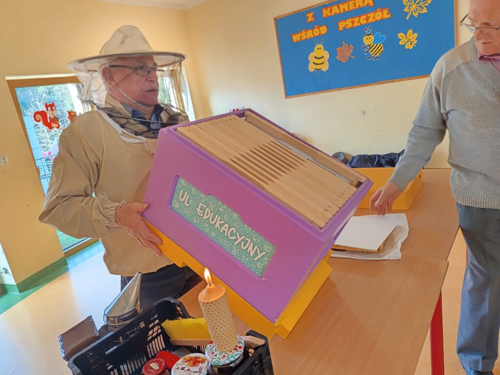 Uczniowie klas 2a i 2b mieli okazję zobaczyć ul edukacyjny, obejrzeć profesjonalny strój pszczelarza oraz dowiedzieć się wielu ciekawostek o życiu pszczół. Dodatkowo odbyła się prezentacja tworzenia świecy z wosku pszczelego, co wzbudziło ogromne zainteresowanie dzieci.