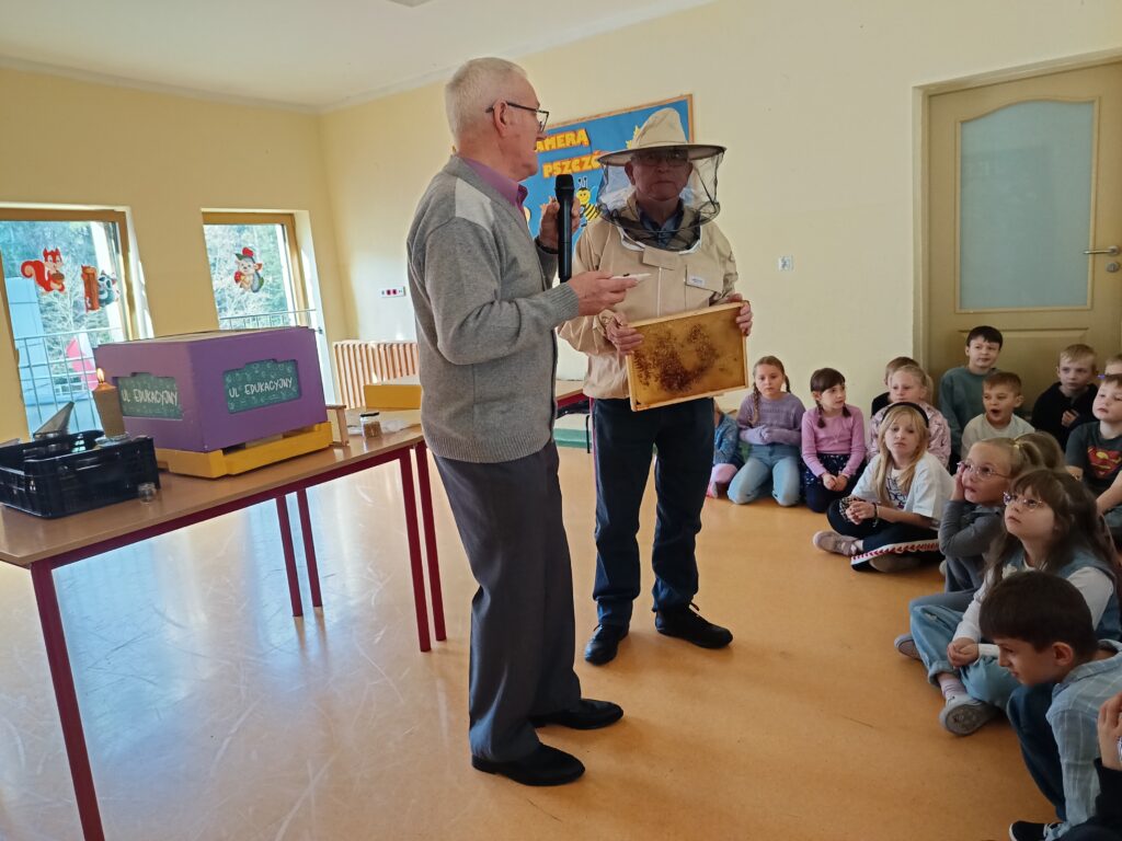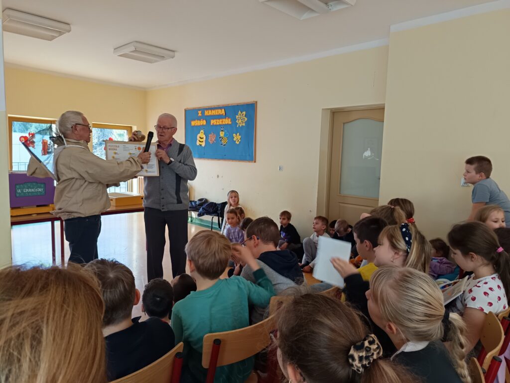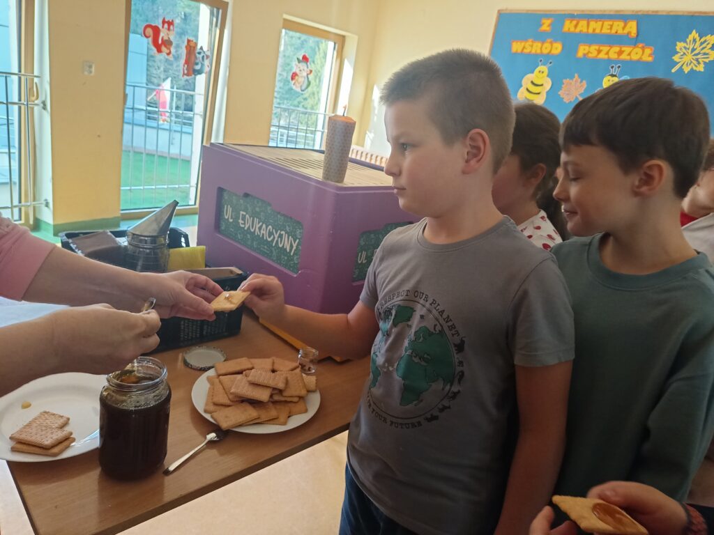Pszczelarze częstowali uczniów pyłkiem i propolisem, a na zakończenie przygotowali słodką niespodziankę – herbatnik z miodem. Spotkanie było nie tylko pouczające, ale też pełne atrakcji i interakcji.